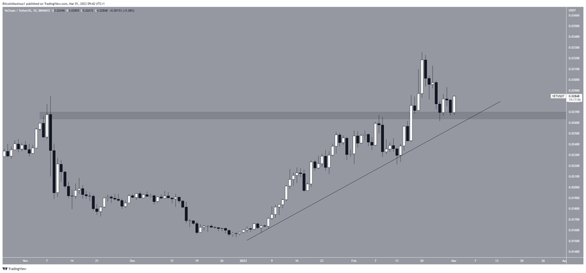 Harga VET tercatat sudah mengalami kenaikan di sepanjang garis ascending support sejak Januari 2023 lalu. Aksi kenaikannya ini kemudian memicu terbentuknya level tertinggi di US$0,033 pada 20 Februari.