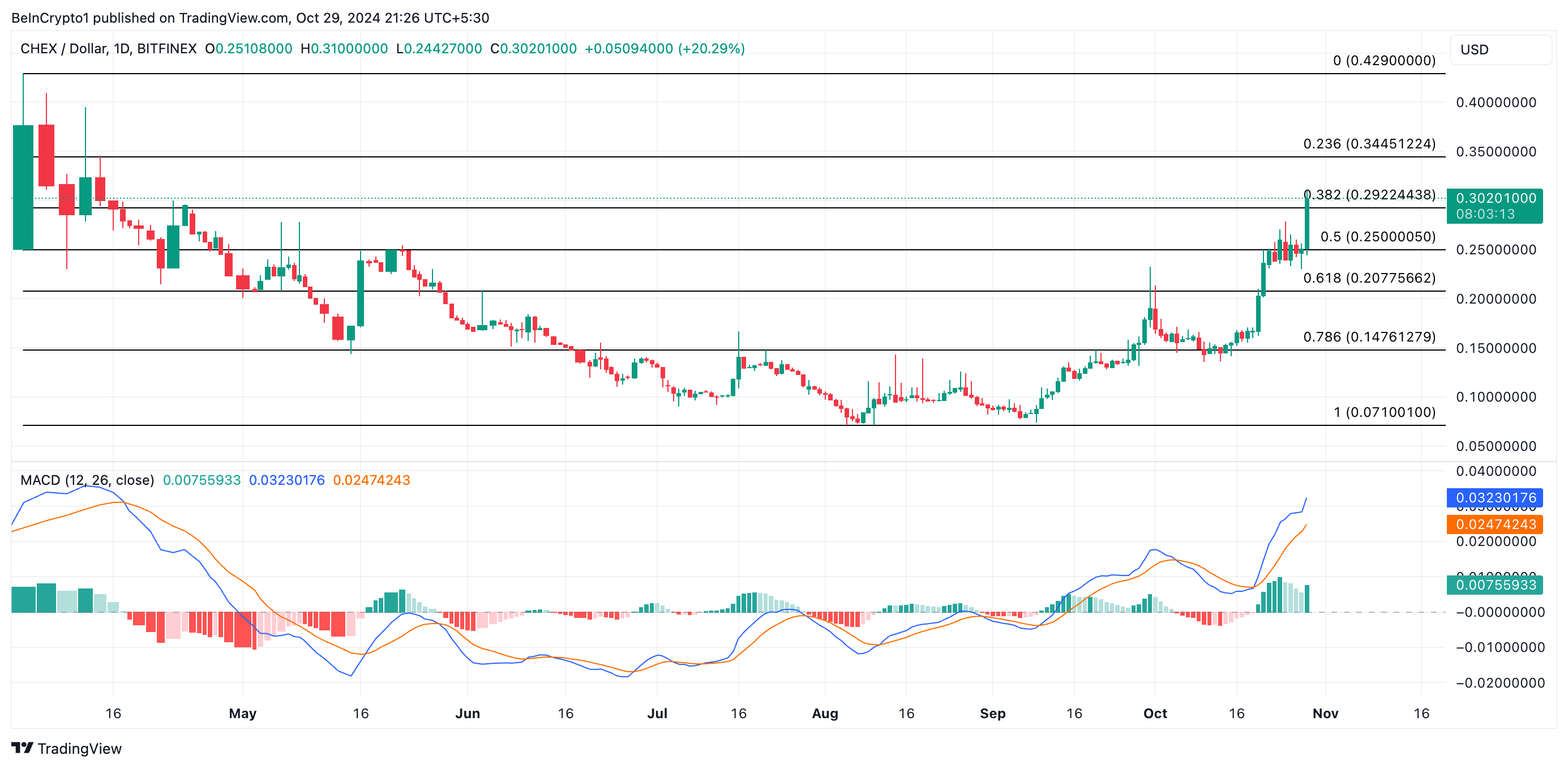 CHEX, token utilitas dari Chintai Network, saat ini nangkring di zona US$0,30, mewakili lonjakan harga 22% dalam sebulan terakhir. Temuan pada moving average convergence/divergence (MACD) mengatakan sinyal adanya potensi reli harga lebih lanjut. Tercatat, garis MACD CHEX (biru) berada di atas garis sinyalnya (oranye).