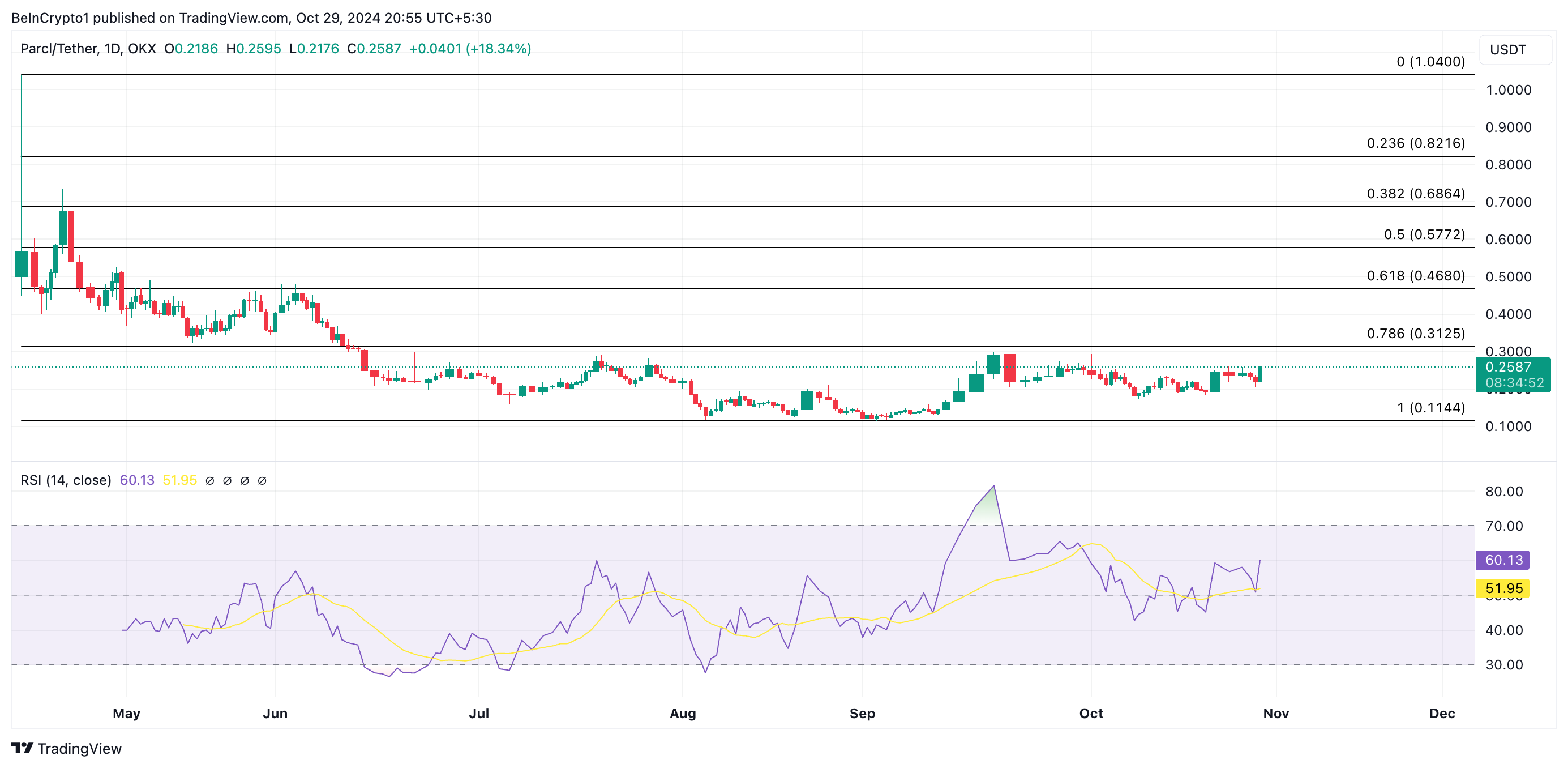 Parcl adalah platform perdagangan real estate terdesentralisasi yang mencatatkan pertumbuhan harga native token 28% dalam tujuh hari terakhir. Permintaan yang meningkat atas altcoin ini tecermin dari naiknya Relative Strength Index (RSI) PRCL. RSI adalah indikator yang mengamati kondisi pasar untuk menentukan apakah suatu aset sedang overbought (jenuh beli) atau oversold (jenuh jual).