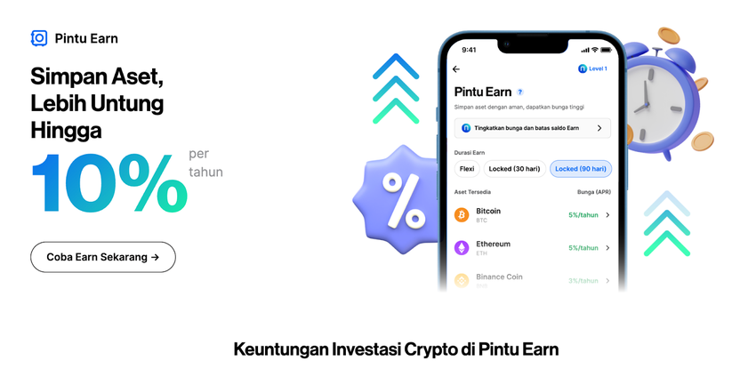 Dengan memanfaatkan fitur Pintu Earn, kamu tidak hanya berinvestasi pada Bitcoin, tetapi juga memiliki kesempatan untuk menyebarkan investasi ke berbagai aset crypto lainnya. Fitur ini memberikan keuntungan tambahan berupa bunga tahunan, yang bisa meningkatkan nilai total portofolio kamu, sekaligus membantu dalam diversifikasi portofolio untuk mengurangi risiko.
