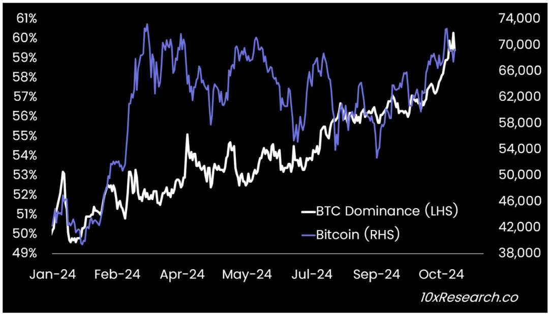 Di tahun 2024, Bitcoin Dominance melonjak dari 50% menjadi 60%, meskipun harganya stabil di kisaran US$74.000. Perubahan ini mencerminkan pergeseran alokasi baik dari investor TradFi melalui ETF maupun holder kripto yang mulai meninggalkan altcoin demi Bitcoin.