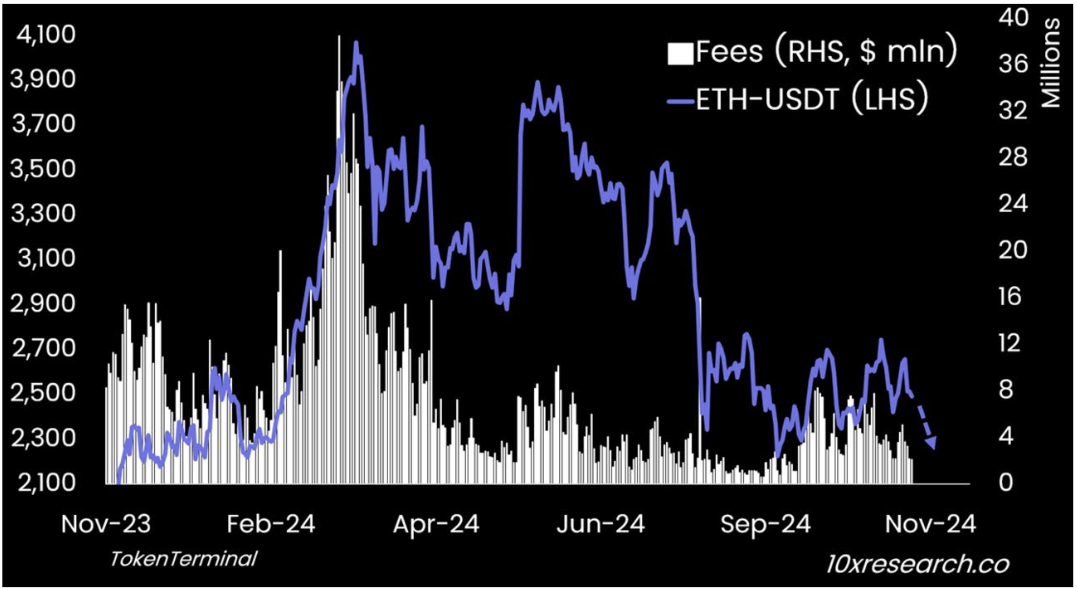 Setelah pertemuan FOMC pada bulan September, gas fee Ethereum dan aktivitas DeFi sempat meroket, memperkecil selisih imbal hasil antara obligasi tradisional dan staking ETH. Namun, seiring naiknya imbal hasil obligasi, aktivitas DeFi kembali meredup, menekan biaya Ethereum.