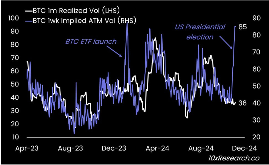 Volatilitas tersirat (implied volatility / IV) untuk opsi at-the-money Bitcoin melonjak hingga 85%, hampir menyamai level saat peluncuran ETF di bulan Januari. Selisih antara implied volatility dan realized volatility kini menyentuh angka 50 poin—suatu rekor baru.