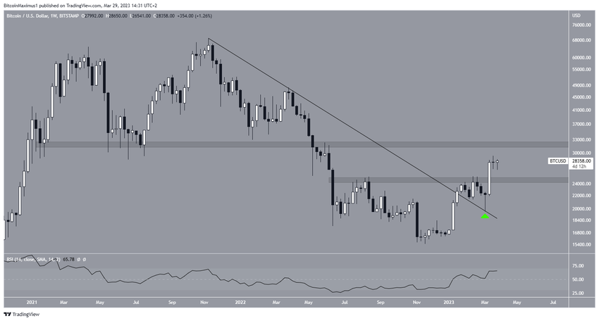 Pada tanggal 13-20 Maret, harga Bitcoin (BTC) mencatatkan minggu paling bullish dalam kurun waktu lebih dari tiga tahun, dengan kenaikan sebesar 27%. Kenaikan ini juga mengonfirmasi breakout dan uji ulang (retest) dari garis descending resistance jangka panjang sejak tercapainya ATH. Selain itu, aksi ini juga berhasil membuat RSI mingguannya bergerak di atas 50 dengan signifikan.