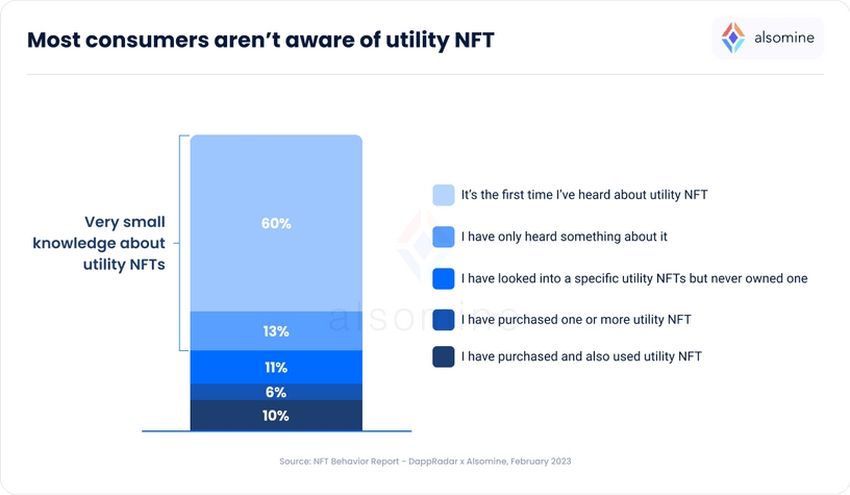 Namun, menurut sebuah laporan terbaru yang DappRadar dan Alsomine terbitkan pada hari Rabu (15/2), pesan tersebut masih belum menjangkau cukup banyak orang. Temuan dari penilitian mereka menunjukkan bahwa 60% konsumen NFT bahkan belum pernah mendengar tentang utility NFT. Sedangkan, sebanyak 13% hanya pernah mendengar “sesuatu tentang [istilah] itu.”