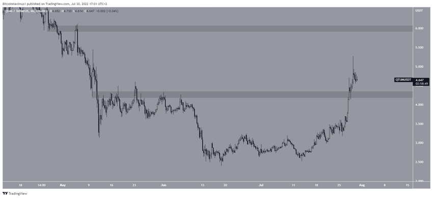 Di sisi lain, QTUM juga telah mengalami kenaikan sejak tanggal 13 Juli dan berhasil menembus area resisten horizontal di level US$4,20 pada tanggal 28 Juli. Aset ini kemudian memvalidasi level tersebut sebagai titik support di hari berikutnya (ikon hijau). Sementara itu, untuk area resisten terdekat berikutnya akan berada di level US$6.