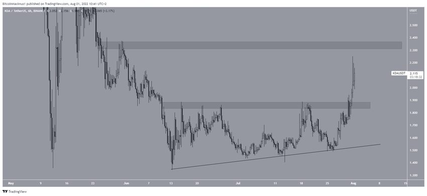 KDA mulai mengalami lonjakan harga pada tanggal 31 Juli dan sejauh ini telah mencapai titik tertingginya di level US$2,25. Sedangkan, area resisten terdekat berikutnya berada di level US$2,35.