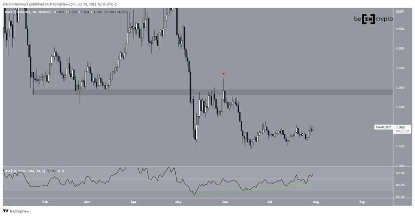 Tepat pada tanggal 9 Mei, KAVA sempat menembus area horizontal di level US$2,90 dan memvalidasinya sebagai titik resisten pada tanggal 31 Mei (ikon merah). Setelah itu, harganya turun dan anjlok ke titik terendahnya di level US$1,39 pada tanggal 18 Juni.