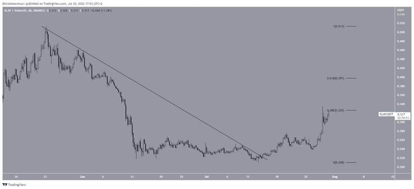 Sama seperti beberapa aset yang sudah disebutkan di atas, KLAY juga telah berhasil menjebol garis descending resistance pada tanggal 14 Juli. Dan saat ini, ia tengah mencoba untuk bergerak di atas area resisten retracement Fib pada titik 0,382 di level US$0,325. Jika ini berhasil, maka area resisten terdekat berikutnya adalah di level US$0,397. Kemudian, aksi ini akan menjadikan level resisten retracement Fib berada di 0,618.