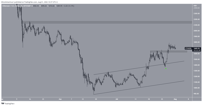 Pada tanggal 18 Juli lalu, ETH telah menjebol ascending parallel channel yang telah bertengger selama satu bulan. Setelah itu, aset ini kembali lagi untuk memvalidasi area itu sebagai titik support pada tanggal 26 Juli (ikon hijau) sebelum kembali memantul dan melanjutkan aksi pergerakan naiknya. Jika ETH berhasil bertahan di atas area horizontal pada level US$1.635, maka harganya berpotensi akan terus melesat menuju level US$2.150.