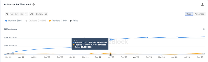 Sebagai konfirmasi dari prospek bullish ini, data dari IntoTheBlock menunjukkan bahwa sebanyak 3.460 investor Shiba Inu lainnya telah beralih menjadi holder jangka panjang pada Agustus.