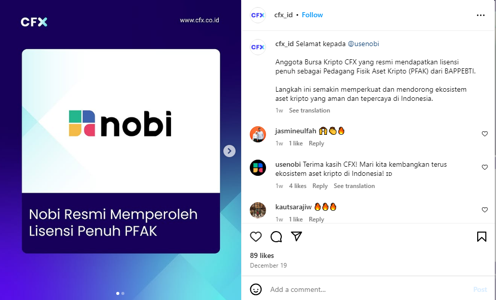 Satu-satunya bursa berjangka kripto uang diatur oleh pemerintah, CFX melalui laman media sosialnya menambahkan, lisensi penuh Usenobi akan semakin memperkuat dan mendorong ekosistem aset kripto yang aman dan tepercaya di Indonesia.