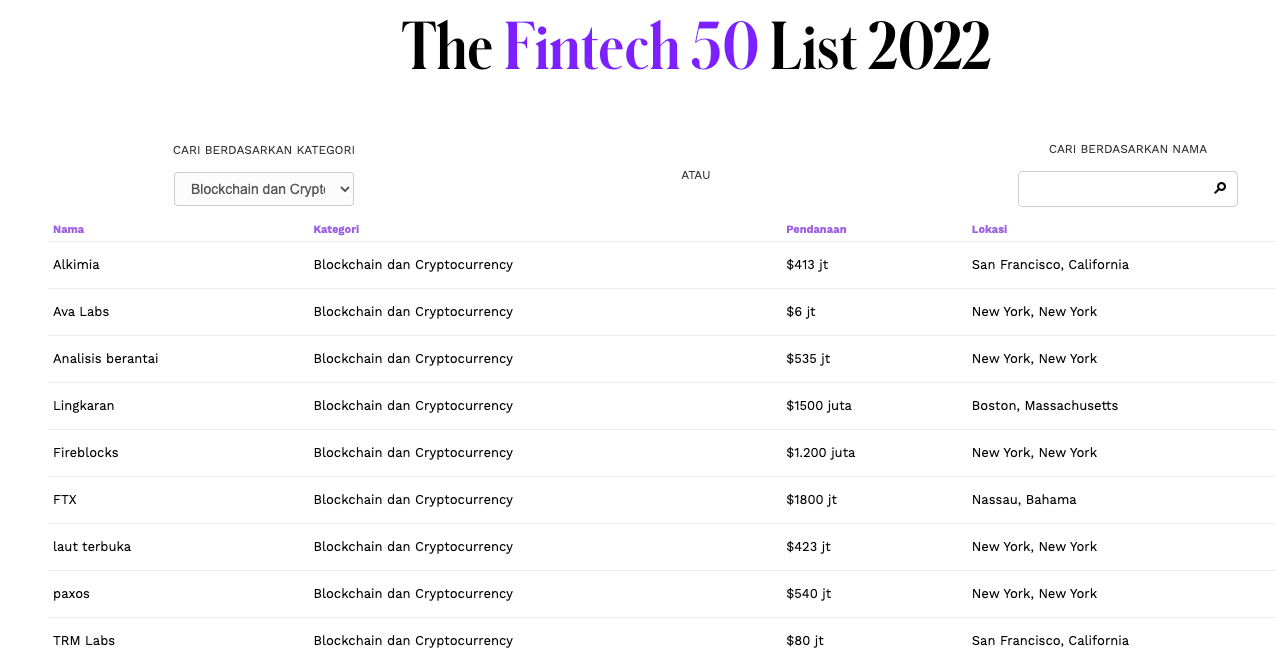 Jajaran perusahaan kripto yang masuk dalam daftar kali ini meliputi, FTX, OpenSea, Alchemy, Ava Labs, Circle Internet Financial, Chainalysis, Fireblocks, Paxos, dan TRM Labs.