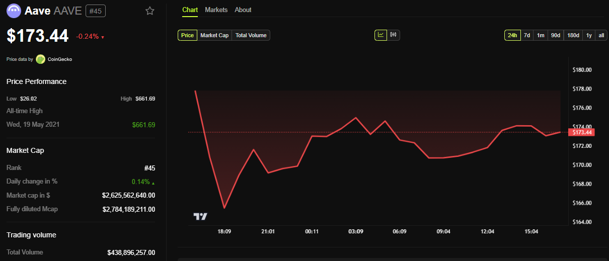 Data BeInCrypto menunjukkan bahwa harga AAVE diperdagangkan pada US$173,44 pada waktu publikasi, turun 0,24% sejak sesi Kamis dibuka.