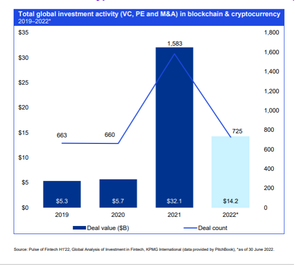 “Selama semester pertama kesepakatan investasi terbesar dihasilkan oleh Trade Republic yang mengantongi US$1 miliar, kemudian US$550 juta oleh Fireblocks dan US$500 juta pendanaan yang diterima oleh FTX di Bahama,” ungkap laporan KPMG.