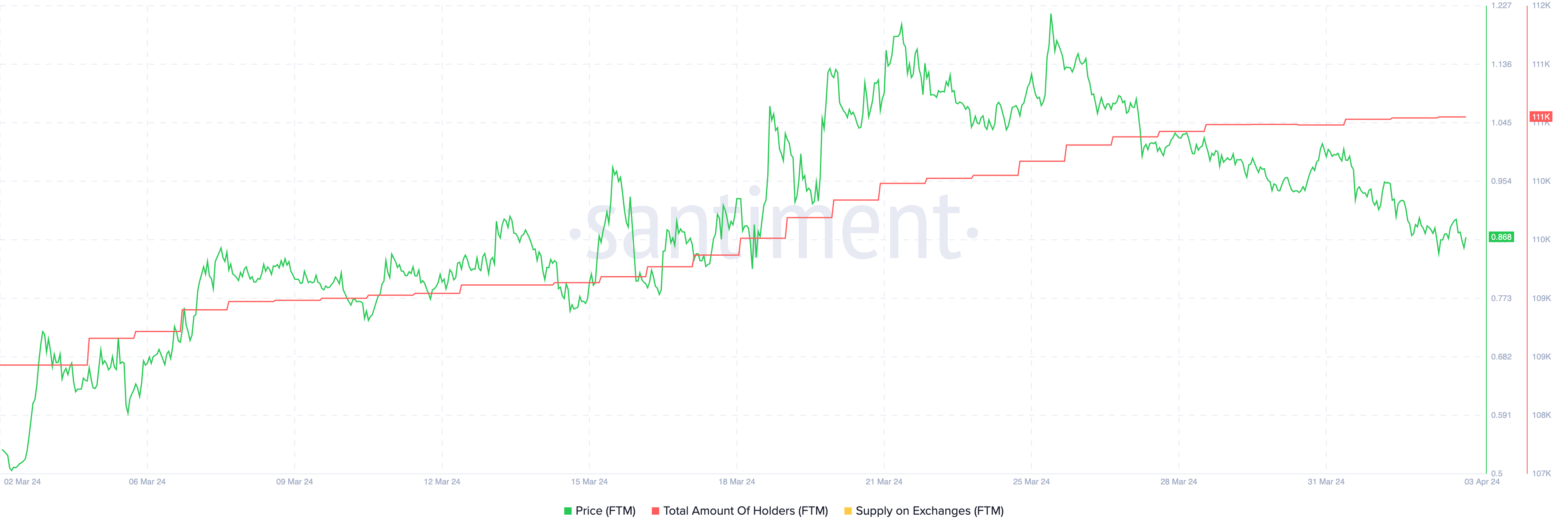 Dari tanggal 17 hingga 28 Maret lalu, FTM membukukan lonjakan jumlah holder yang luar biasa. Jumlahnya tumbuh dari 109.930 menjadi 111.280, dengan rata-rata 122 holder baru setiap harinya. Menariknya, pertumbuhan ini terjadi berbarengan dengan lonjakan harga FTM yang signifikan dari US$0,78 menjadi US$1,03.