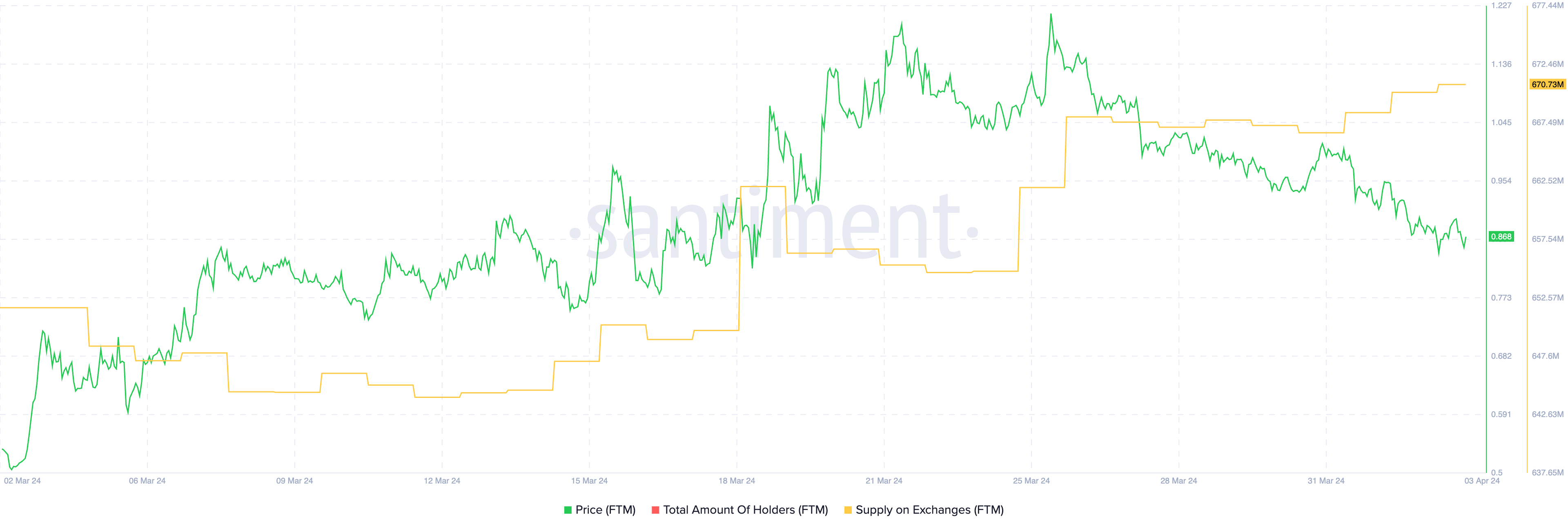 Tak hanya itu, pasokan FTM di crypto exchange terpantau melejit dari angka 654,83 juta menjadi 670,73 juta. Sebagai catatan, peningkatan pasokan di crypto exchange biasanya mengindikasikan penurunan harga. Dengan demikian, hal ini mengimplikasikan bahwa lebih banyak holder yang berencana menjual. Pada gilirannya, aksi ini bisa menyeret harga FTM turun akibat tekanan jual yang kian intens.