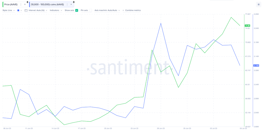 Grafik di bawah ini menunjukkan bahwa whale yang memegang 1 juta hingga 10 juta token AAVE telah meningkatkan kepemilikan mereka sejak 22 Juni lalu. Hal yang cukup mengejutkan, pada periode antara 23 Juni dan 5 Juli, mereka telah membeli sebanyak 190.000 token AAVE.