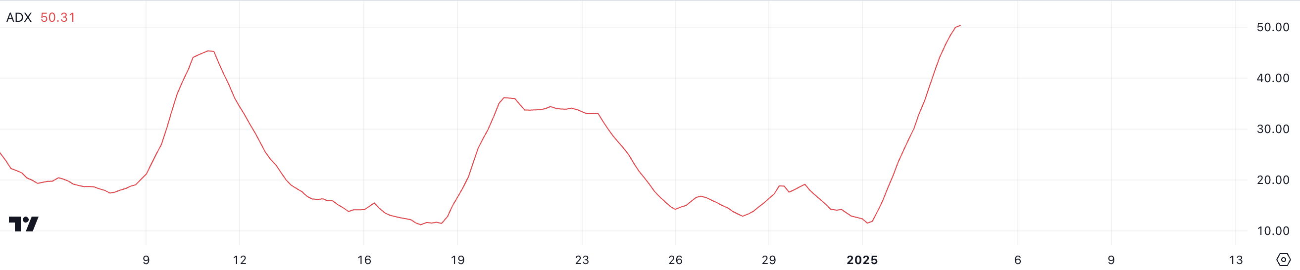 ADX, atau Average Directional Index, mengukur kekuatan tren pada skala dari 0 hingga 100. Nilai di atas 25 menunjukkan tren kuat, sementara pembacaan di bawah 20 menunjukkan momentum tren yang lemah atau tidak ada. ADA ADX pada 50,3 menyoroti adanya tren yang sangat kuat, memperkuat momentum bullish yang terlihat selama lonjakan harga.