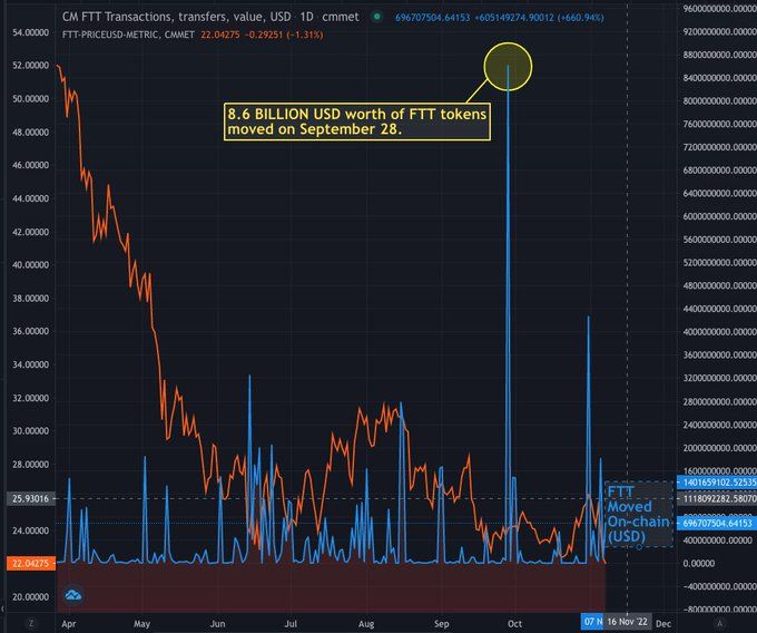 Pada 28 September lalu, senilai lebih dari US$8,6 miliar dipindahkan secara on-chain. Sejauh ini, perpindahan tersebut adalah pergerakan harian token FTT terbesar dalam keberadaan token itu. Selain itu, juga merupakan salah satu pergerakan harian token standar ERC-20 terbesar yang pernah dicatat oleh CoinMetrics.