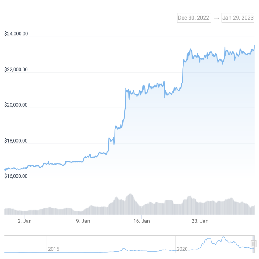 Selama 30 hari terakhir, kinerja harga kedua aset digital andalan tersebut sukses mengantarkan mereka kembali ke level yang sempat dicapai ketika sebelum insiden FTX. Bitcoin telah diperdagangkan di atas angka US$23.000, sementara Ethereum naik tajam di atas US$1.600 untuk pertama kalinya sejak September 2022.