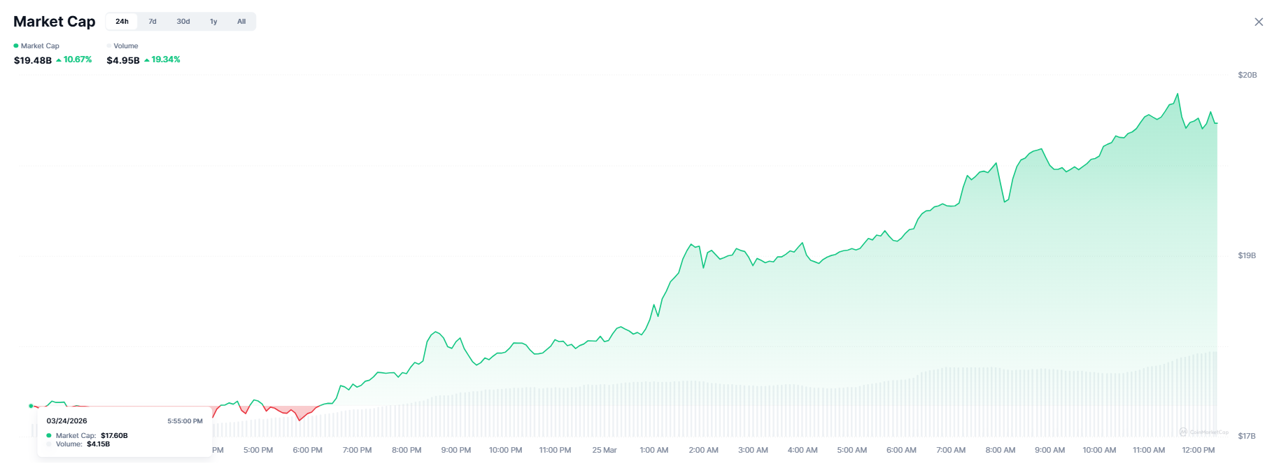 Sektor aset kripto AI melonjak 10,67% pada 25 Maret 2026, sehingga kapitalisasi pasar gabungan naik dari US$17,60 miliar menjadi US$19,48 miliar hanya dalam satu sesi. Volume perdagangan juga meningkat 19,34% menjadi US$4,95 miliar seiring reli tersebut, yang menandakan reli ini didukung partisipasi nyata dan bukan hanya kenaikan harga di pasar yang tipis.