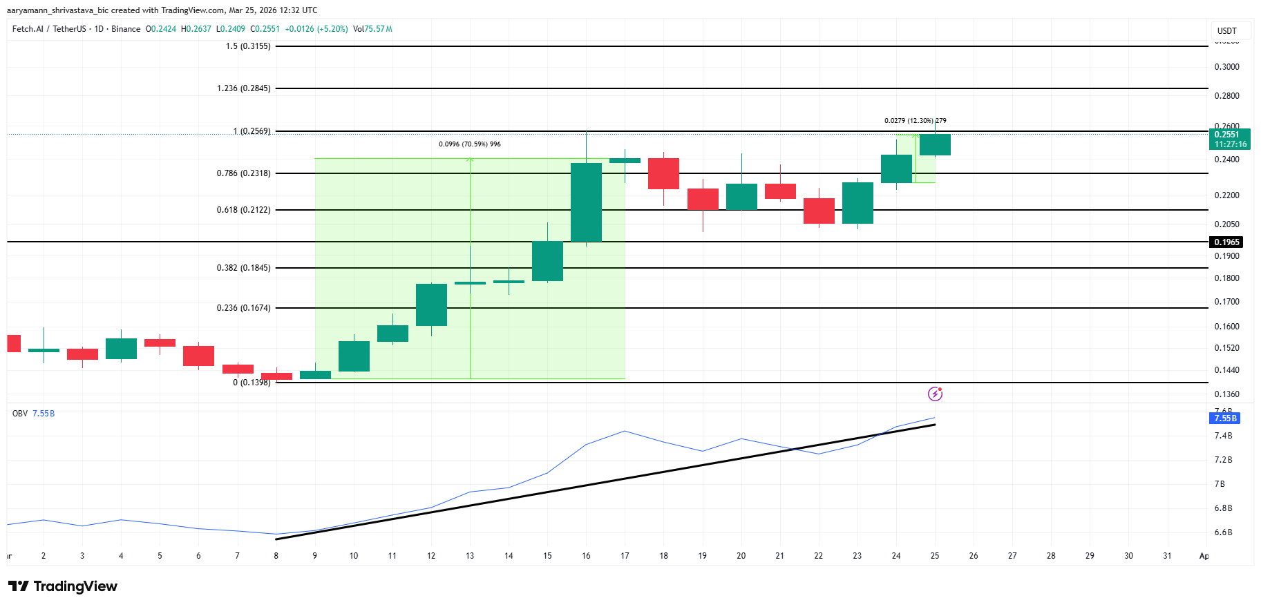 Fetch.AI (FET) diperdagangkan pada level US$0,2551 di grafik harian, naik 5,20% dalam sehari setelah sempat menyentuh terendah di US$0,2409. Grid retracement Fibonacci berjalan dari titik terendah siklus di US$0,1398 hingga titik tertinggi ayunan di US$0,2569. Harga sedang menekan level ekstensi 1,0, dengan pergerakan terukur sebelumnya sebesar 70,59% sudah tercapai dari dasar US$0,1398.