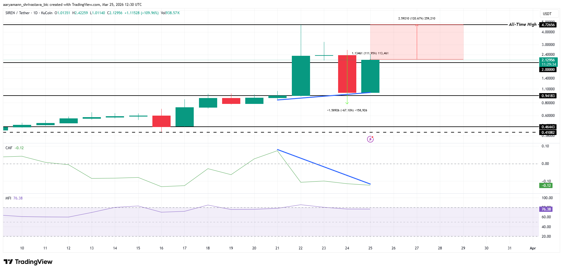 Salah satu aset kripto lain yang juga tampil kuat hari ini adalah SIREN, yang sekarang diperdagangkan di US$2,12, naik 109,96% dalam satu sesi — salah satu lonjakan harian terbesar di sektor AI. Di grafik harian, harga berhasil merebut kembali level US$2,00 setelah sebelumnya terkoreksi 67,10% ke US$0,9418, dan Money Flow Index (MFI) berada di 76,38 yang artinya sudah di zona overbought.