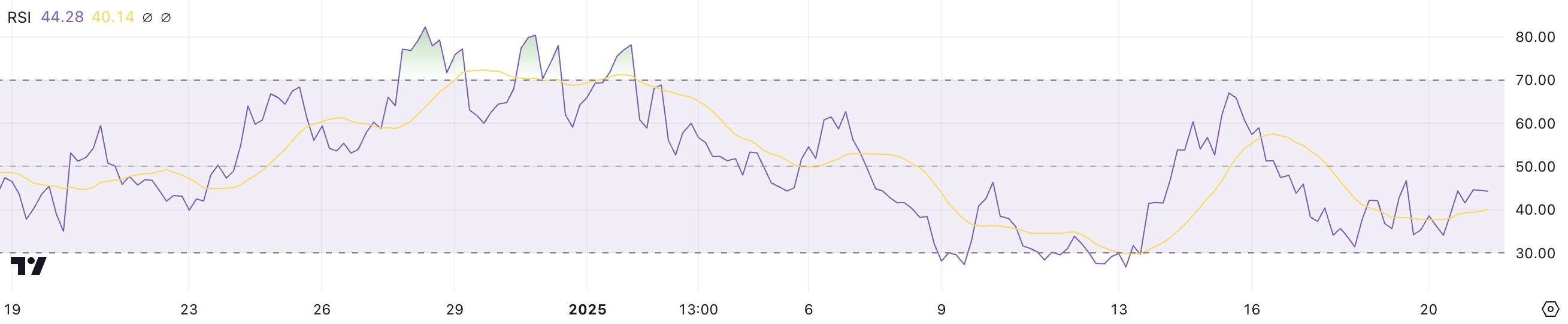 Di 44,2, RSI AI16Z mencerminkan momentum yang membaik meskipun masih di bawah titik tengah netral 50, menunjukkan pemulihan yang hati-hati. Level ini menunjukkan bahwa harga AI16Z bisa stabil lebih lanjut atau melihat kenaikan moderat saat bergerak menuju wilayah netral. Pergerakan naik tambahan diperlukan untuk menandakan tren bullish yang lebih kuat, terutama jika momentum baik di sekitar aset kripto kecerdasan buatan kembali.