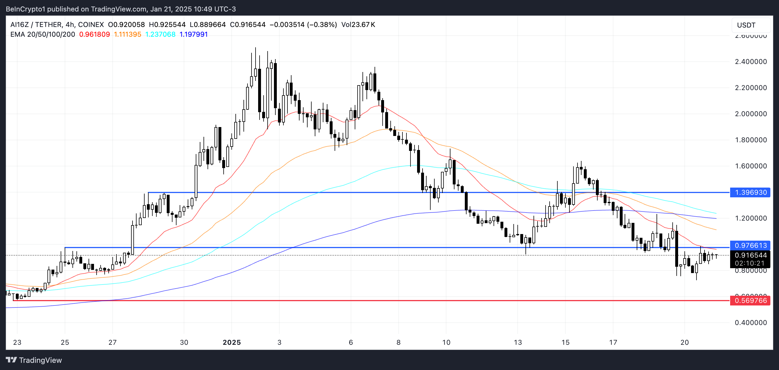 Sebaliknya, jika harga AI16Z berhasil mengembalikan tren naiknya, mungkin akan menantang resistance di US$0,976. Menembus resistance ini bisa membuka jalan untuk kenaikan berkelanjutan, dengan US$1,39 sebagai target utama berikutnya, menjadikannya salah satu koin agen AI kripto terbesar di pasar.