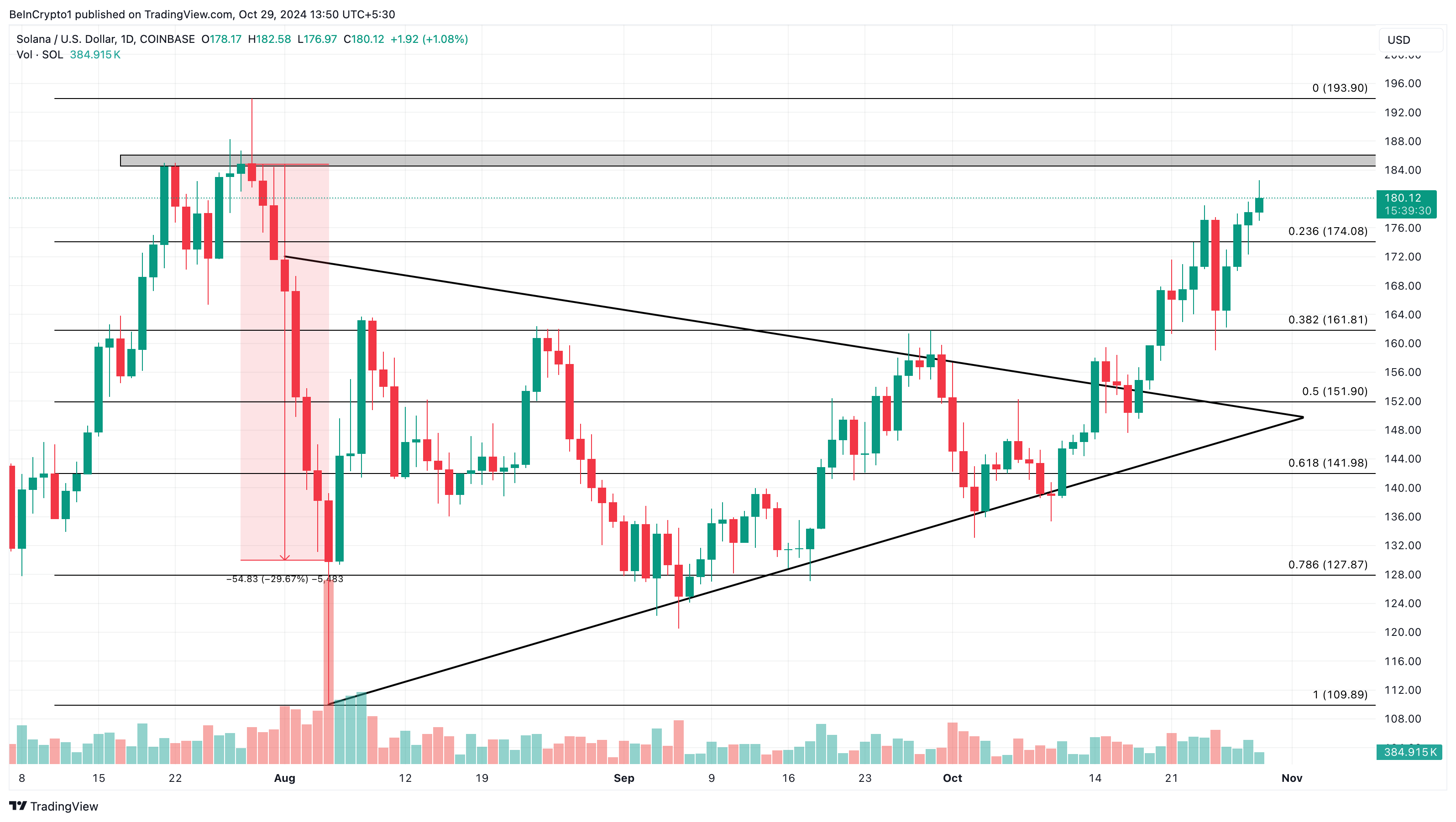 Pada grafik harian, harga Solana berhasil retest pada tanda US$180 setelah breakout dari pola segitiga naik. Breakout ini menandakan tren bullish, menunjukkan bahwa trader bersemangat untuk mendorong harga lebih tinggi.
