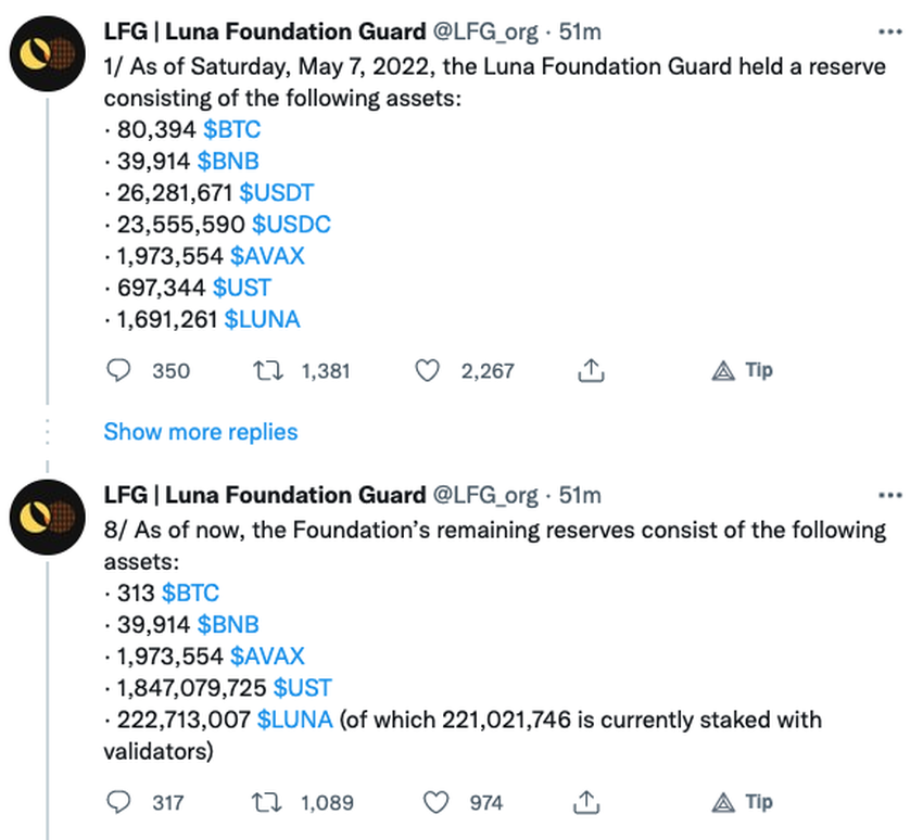 Luna Foundation Guard adalah organisasi nirlaba yang bertugas menjaga dan mendistribusikan dana yang sudah dikumpulkan oleh ekosistem Terra untuk proyek stablecoin UST. Pasar kripto sudah sangat menyadari adanya masalah yang dialami oleh UST, ketika stablecoin ini kehilangan patokan nilainya terhadap dolar AS. Kejatuhan UST ini turut menyeret Bitcoin beserta aset-aset kripto lainnya di pasaran ke dalam “jurang”.