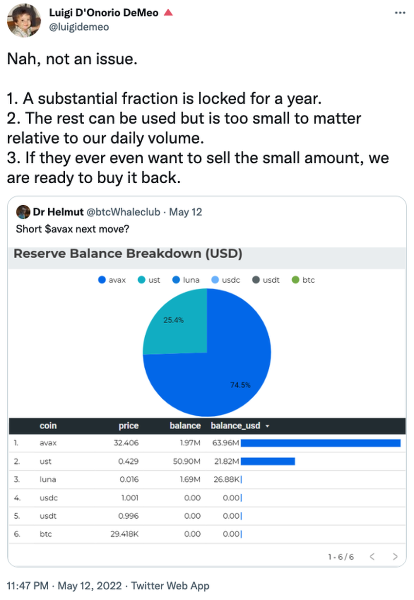 Tim Avalanche menghubungi redaksi Be[In]Crypto setelah berita ini tayang. Di tanggal 12 Mei, Luigi D’Onorio DeMeo, Kepala DeFi Ava Labs, ternyata sudah menjawab pertanyaan ini di Twitter. Saat itu, DeMeo yakin bahwa AVAX tak akan ikut terdampak dari tragedi ini. Ia menyampaikan 3 argumen berikut kepada holder AVAX agar tetap tenang dalam situasi ini: