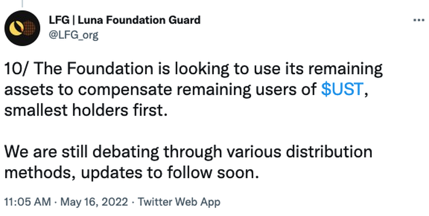 LFG menyatakan, mereka akan menganalisa apakah akan menggunakan sisa cadangan dana mereka untuk memberikan ganti rugi kepada para holder UST yang mengalami kerugian. Dalam cuitannya, LFG menyebut bahwa mereka akan mengutamakan holder terkecil lebih dulu.