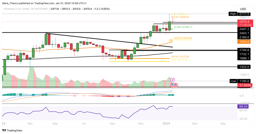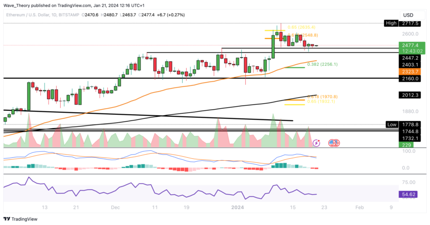 Begitu harga Ethereum tertolak secara bearish pada level golden ratio di sekitar US$2.600, Ethereum kemudian memulai koreksi harga. Itu artinya, Ethereum sekarang sudah menemukan level support horizontal di kisaran US$2.400 hingga US$2.450.