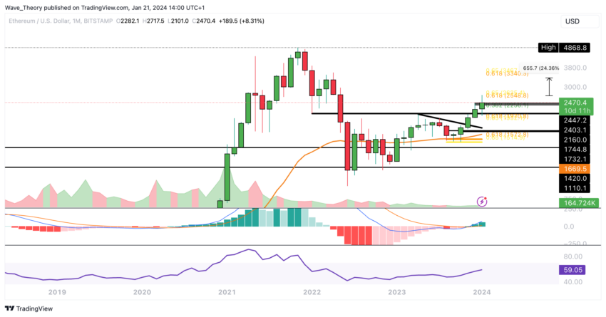 Secara keseluruhan, pergerakan naik yang bullish ini akan tetap utuh selagi harga ETH tetap bertengger di atas golden ratio di sekitar US$1.550. Sementara itu, apabila Ethereum akhirnya sukses menembus golden ratio di sekitar US$2.600, maka harga ETH berpotensi melesat naik menuju golden ratio berikutnya di kisaran US$3.400.