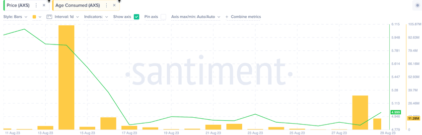Aktivitas perdagangan bearish di kalangan holder jangka panjang AXS rupanya telah memberikan tantangan bagi upaya whale yang bullish minggu ini. Seperti yang terlihat di bawah ini, Axie Infinity telah mencatat lonjakan yang mencolok dalam metrik Age Consumed selama beberapa hari terakhir. Dalam hal ini, Age Consumed AXS melampaui angka 34 juta pada 28 Agustus. Ini merupakan capaian tertingginya sejak mencetak angka 104,82 juta pada 14 Agustus yang akhirnya memicu koreksi harga sebesar 20%.