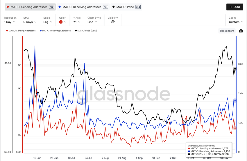 Secara logis, bullish divergence terjadi ketika jumlah wallet yang membeli MATIC (alamat penerima) meningkat bersamaan dengan penurunan jumlah penjual (alamat pengirim). Hal ini nampaknya telah berperan penting dalam rebound harga MATIC sebesar 7% dari harga terendah mingguannya yang tercatat US$0,73 pada 21 November menjadi US$0,78 pada 23 November.