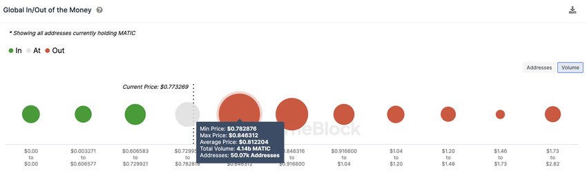 Namun, data tersebut menunjukkan bahwa para bull harus menembus resistance awal di US$0,80 terlebih dahulu agar dapat percaya diri untuk menguji ulang level US$1. Seperti yang terlihat di bawah ini, 50.007 alamat telah membeli 4,14 miliar MATIC dengan harga rata-rata US$0,81. Jika para holder tersebut menjual lebih awal, mereka dapat secara efektif menggagalkan reli harga MATIC.