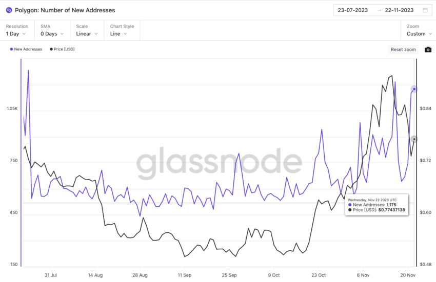 Berdasarkan grafik on-chain Glassnode di bawah ini, tepatnya pada 22 November, jumlah harian wallet MATIC baru yang dibuat telah mencapai 1.175 alamat. Angka ini hanya terpaut 42 wallet dari puncak empat bulan sebanyak 1.217 Alamat Baru yang tercatat pada 16 November.