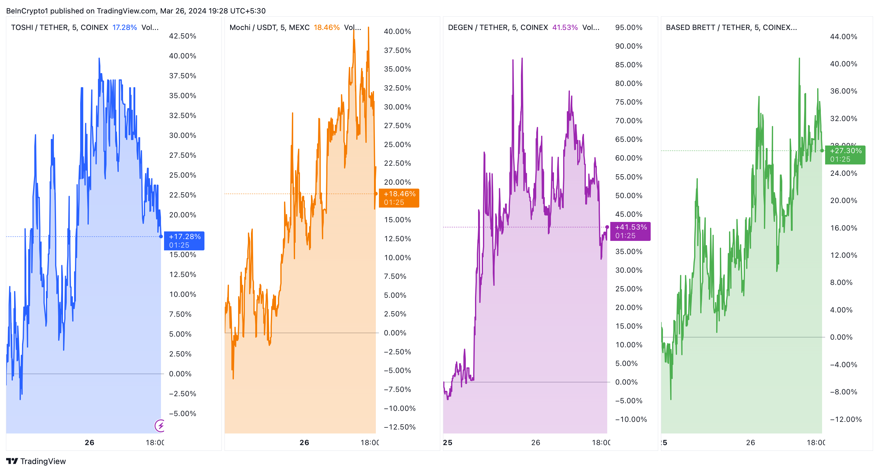 Menyusul agenda burning token BALD, barisan meme coin di jaringan Base pun mengalami apresiasi harga yang signifikan. TOSHI, MOCHI, SMUDCAT, DEGEN, dan BRETT semuanya melonjak, dengan kenaikan berkisar dari 8% hingga yang spektakuler sebesar 154%.