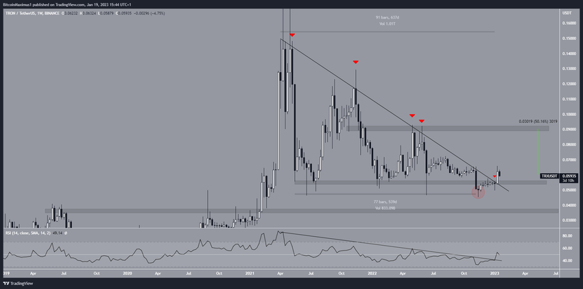 Pada awal bulan November 2022, harga TRON turun di bawah area horizontal US$0,055. Ini adalah perkembangan yang penting karena area tersebut sudah bertahan selama 539 hari. Namun, aksi breakdown tersebut akhirnya tidak valid (lingkaran merah).