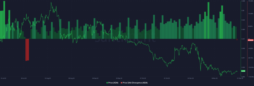 Kemudian, divergensi harga (price divergence) Daily Active Addresses (DAA) mencetak bar merah yang menghadirkan sinyal jual, sama seperti yang terlihat pada Juli 2022.
