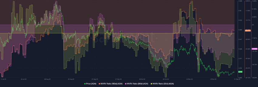 Dengan kondisi ADA yang masih berada di dekat support jangka panjang, aksi harganya pun membutuhkan dorongan yang kuat dari para bulls dan pemegang aset tersebut agar bisa bergerak naik. Namun, MVRV jangka panjang dan jangka pendek yang negatif menunjukkan bahwa para HODler mengalami kerugian.