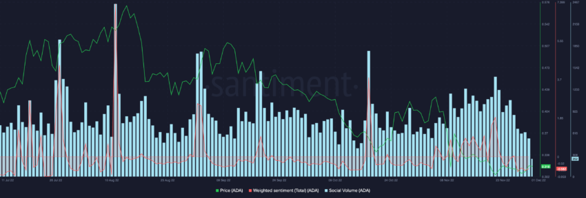 Metrik sosial untuk Cardano juga tampak kosong, dengan volume sosial yang merosot. Sentimen sosial yang terbebani masih negatif dan terombang-ambing mendekati level terendah dalam empat bulan terakhir. Selain itu, sentimen berbobot negatif menunjukkan adanya antisipasi sosial yang rendah di sekitar koin tersebut, sehingga jumlah permintaannya menjadi lebih sedikit.