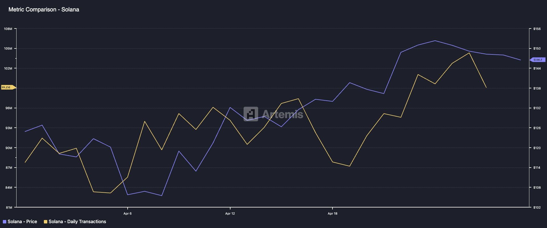 Peningkatan aktivitas pengguna Solana bulan ini terlihat dari meningkatnya jumlah transaksi harian. Menurut data dari Artemis, jaringan ini telah memproses lebih dari 99 juta transaksi sejak awal April, mewakili peningkatan 12% dari bulan ke bulan dalam transaksi harian.
