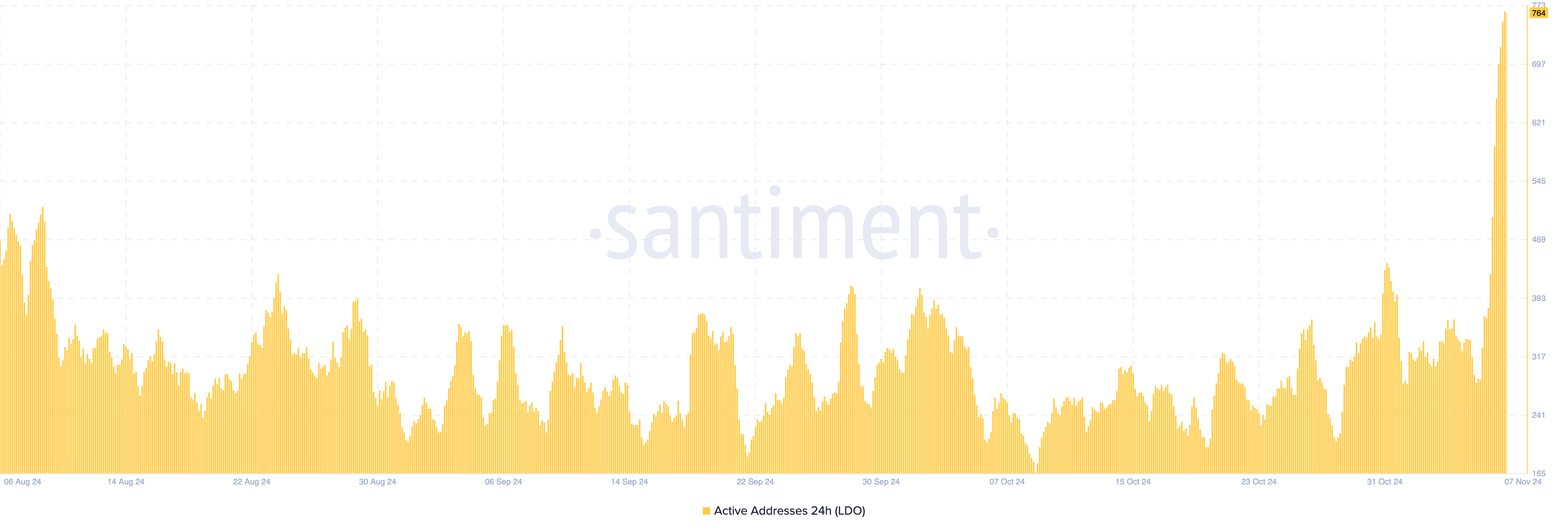 Selain itu, data on-chain dari Santiment menunjukkan bahwa alamat aktif di jaringan Lido telah melonjak ke tingkat tertinggi sejak Agustus.