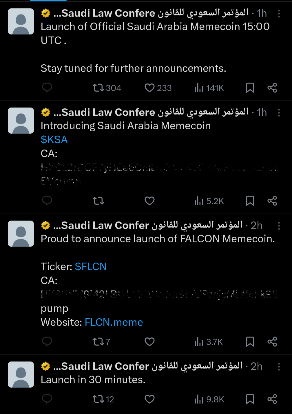 Token tersebut termasuk Saudi Arabia Meme coin (KSA) dan FALCON Meme coin (FLCN).