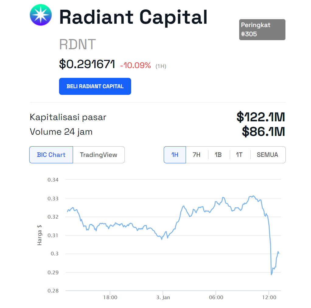 Peristiwa eksploitasi ini rupanya berpengaruh terhadap harga native token Radiant Capital (RDNT). Data BeInCrypto mencatat bahwa dalam kurun 24 jam terakhir, harga token RDNT turun 10,09%. Saat ini, token RDNT diperdagangkan di harga US$0,291671.