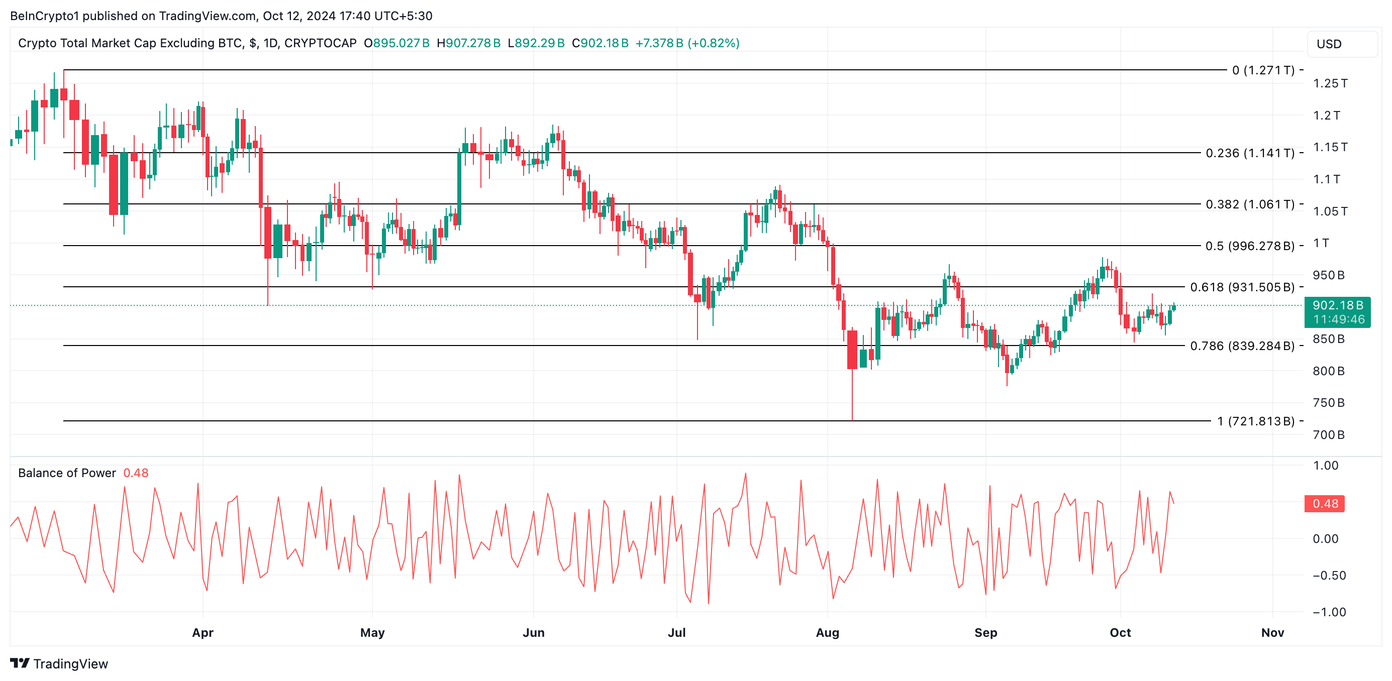 Kebangkitan pasar ini juga terlihat pada indikator momentum TOTAL2, yang dinilai pada grafik satu hari. Misalnya, Balance of Power (BoP) TOTAL2, yang mengukur kekuatan tekanan beli dan jual di pasar, menunjukkan nilai positif di 0,48.